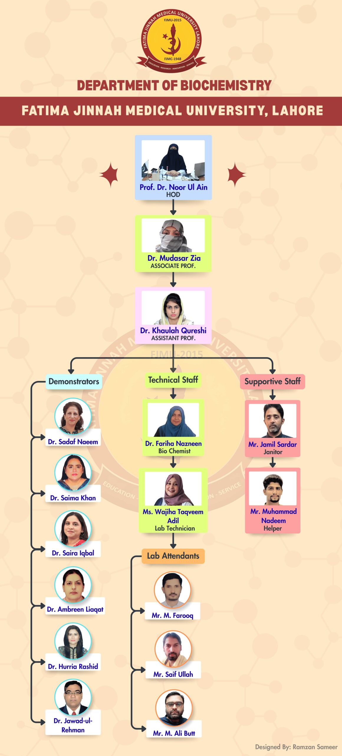 The Department of Biochemistry at Fatima Jinnah Medical College was established in 1980 as a separate entity and was the first amongst all medical colleges affiliated to the University of the Punjab. Prof. Tasnim Majid was its founding head and was actively involved in the establishment of the department.